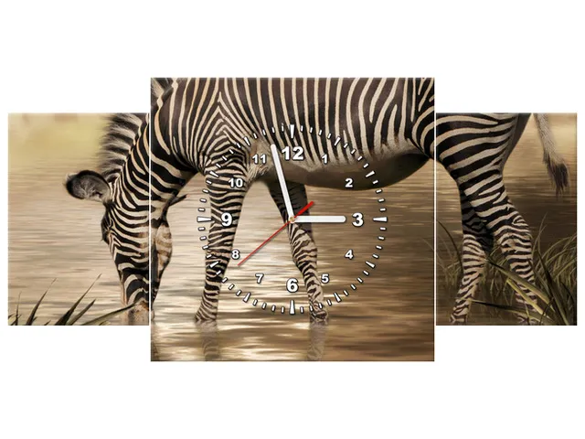 Úvod » Obrazy » Obrazy s hodinami » Dizajnové nástenné hodiny na plátne Zebra pri napájadle