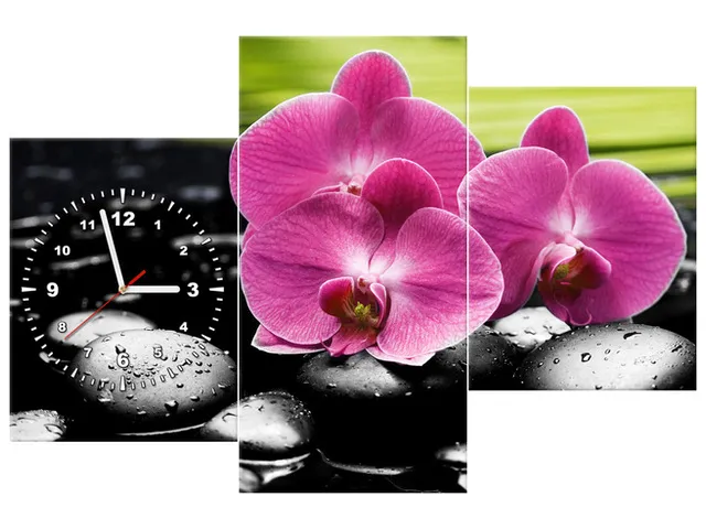 Úvod » Obrazy » Obrazy s hodinami » Luxusný obraz s hodinami Orchidey na kameňoch