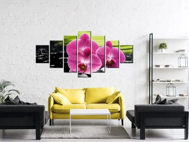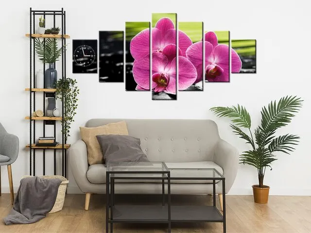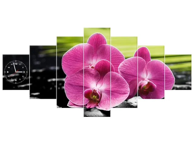 Úvod » Obrazy » Obrazy s hodinami » Luxusný obraz s hodinami Orchidey na kameňoch
