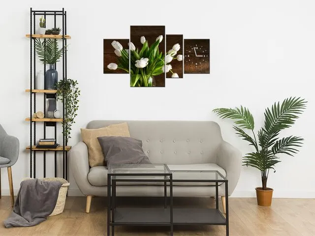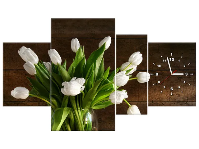 Úvod » Obrazy » Obrazy s hodinami » Moderné nástenné hodiny Snehobiele tulipány