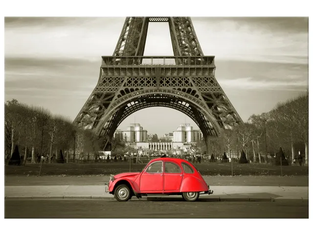 3533A_1M Moderný obraz na stenu Červené auto pred Eiffelovkou |