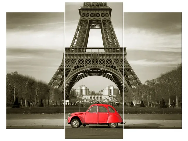3533A_3I Moderný obraz na stenu Červené auto pred Eiffelovkou |