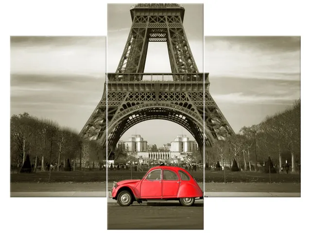 3533A_3K Moderný obraz na stenu Červené auto pred Eiffelovkou |