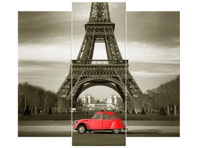 3533A_3M Moderný obraz na stenu Červené auto pred Eiffelovkou |