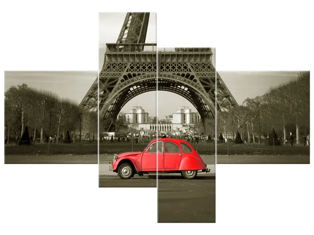 3533A_4Q Moderný obraz na stenu Červené auto pred Eiffelovkou |