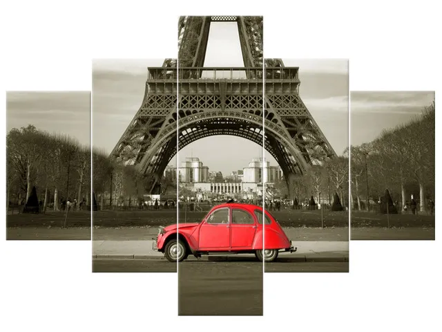 3533A_5B Moderný obraz na stenu Červené auto pred Eiffelovkou |