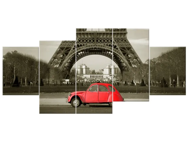 3533A_5E Moderný obraz na stenu Červené auto pred Eiffelovkou |