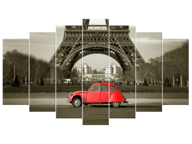 3533A_7A Moderný obraz na stenu Červené auto pred Eiffelovkou |