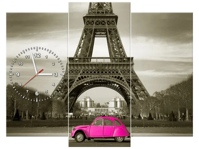 Úvod » Obrazy » Obrazy s hodinami » Moderný obraz s hodinami Auto pred Eiffelovou vežou