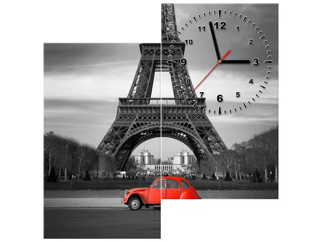 Úvod » Obrazy » Obrazy s hodinami » Moderný obraz s hodinami Červené auto pred Eiffelovkou