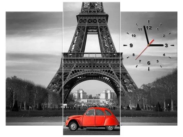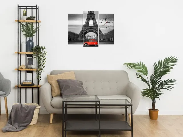 ZP1116A_3V Moderný obraz s hodinami Červené auto pred Eiffelovkou |