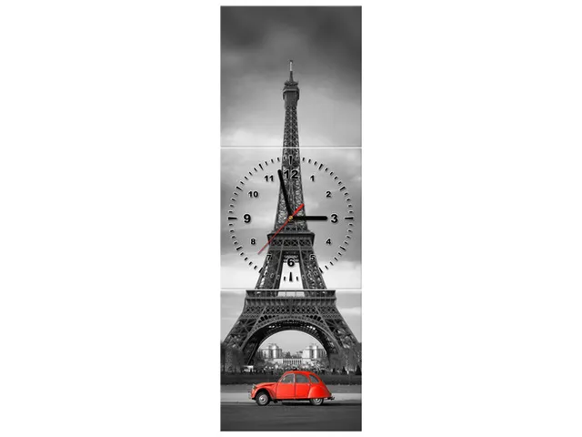 Úvod » Obrazy » Obrazy s hodinami » Moderný obraz s hodinami Červené auto pred Eiffelovkou