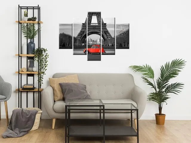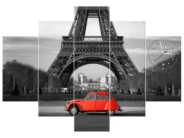 Úvod » Obrazy » Obrazy s hodinami » Moderný obraz s hodinami Červené auto pred Eiffelovkou
