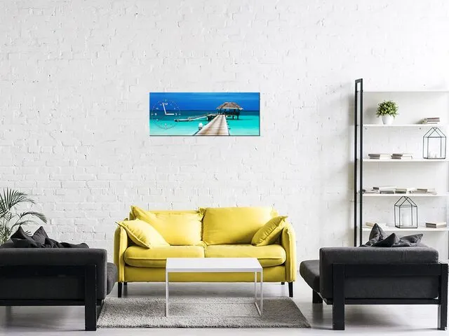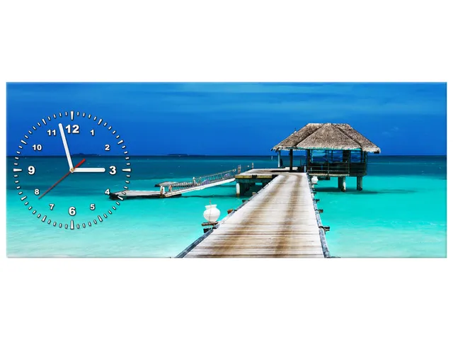 Úvod » Obrazy » Obrazy s hodinami » Moderný obraz s hodinami Chata v trópoch