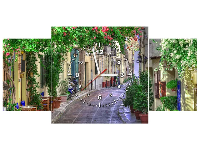 Úvod » Obrazy » Obrazy s hodinami » Moderný obraz s hodinami Grécka ulička