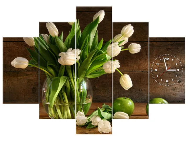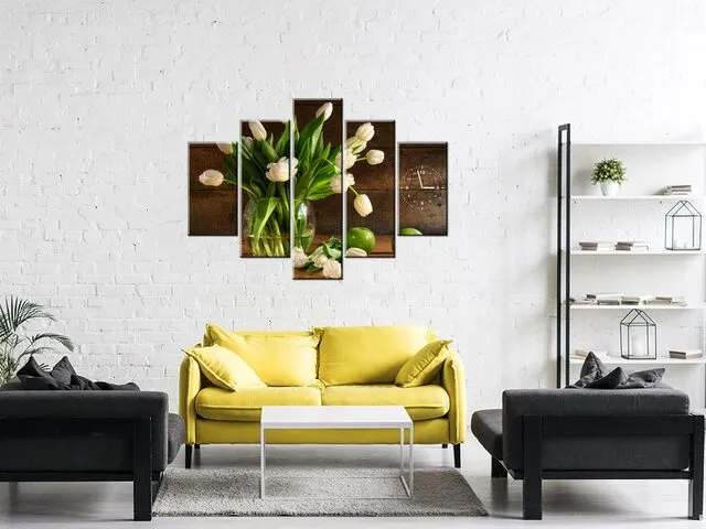 Úvod » Obrazy » Obrazy s hodinami » Moderný obraz s hodinami na stenu Krémové tulipány