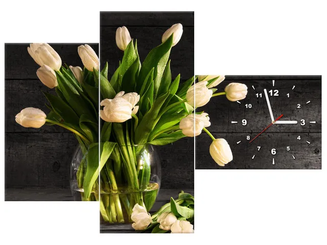 Úvod » Obrazy » Obrazy s hodinami » Moderný obraz s hodinami na stenu Krémové tulipány