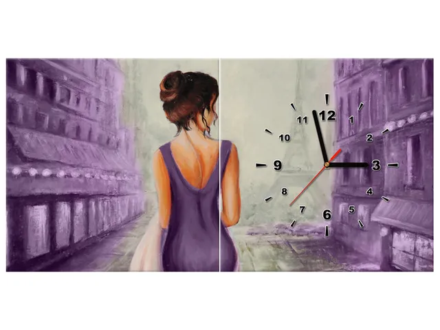 Obraz do spálne s hodinami Prechádzka v Paríži vo fialovej