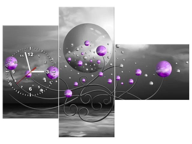 ZP5588A_3K Obraz na stenu s hodinami Fialové gule na sivom pozadí |