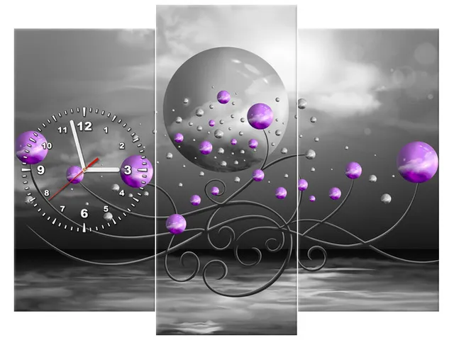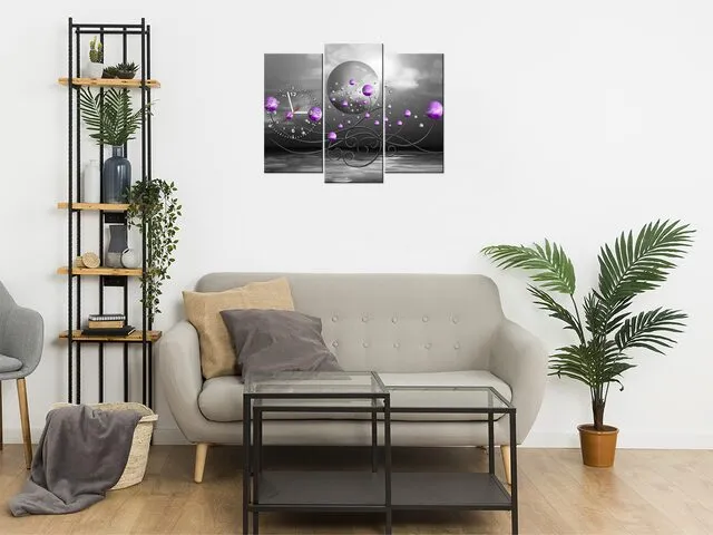 ZP5588A_3K Obraz na stenu s hodinami Fialové gule na sivom pozadí |