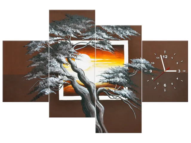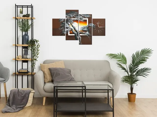 Obraz prírody s hodinami Strom na pozadí zapadajúceho slnka