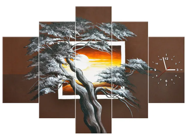 ZP4021A_3V Obraz prírody s hodinami Strom na pozadí zapadajúceho slnka |