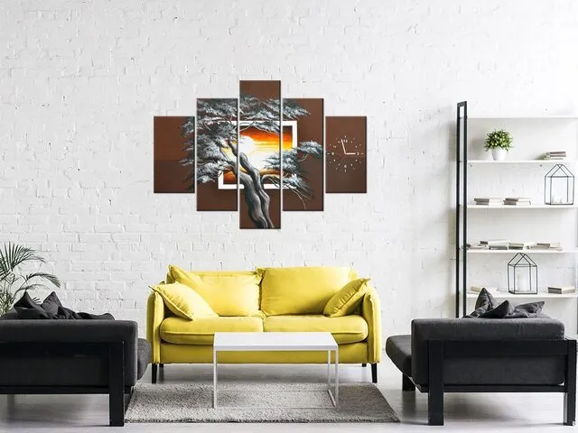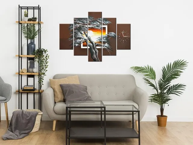 Úvod » Obrazy » Obrazy s hodinami » Obraz prírody s hodinami Strom na pozadí zapadajúceho slnka