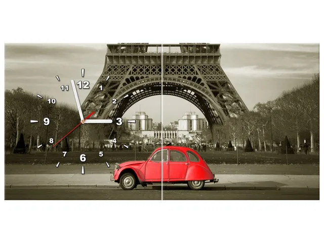 Úvod » Obrazy » Obrazy s hodinami » Obraz s hodinami Červené auto pred Eiffelovou vežou