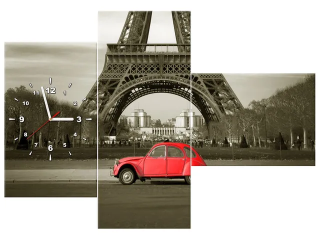 Úvod » Obrazy » Obrazy s hodinami » Obraz s hodinami Červené auto pred Eiffelovou vežou