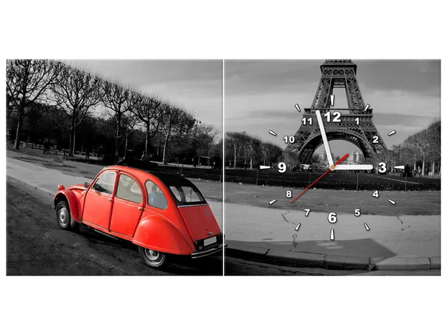 Úvod » Obrazy » Obrazy s hodinami » Obraz s hodinami Červené auto pri Eiffelovej veži