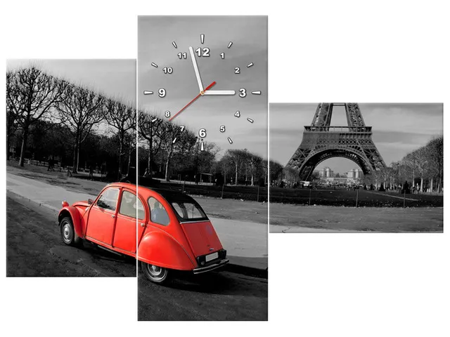 ZP1117A_3K Obraz s hodinami Červené auto pri Eiffelovej veži |