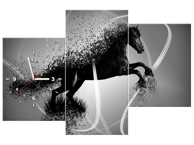 Úvod » Obrazy » Obrazy s hodinami » Obraz s hodinami Čierno biely kôň fragmentácia - Jakub Banas