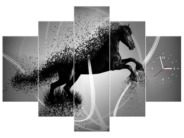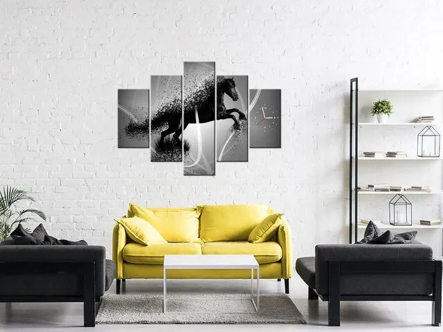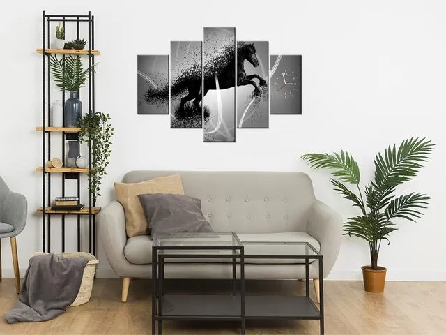 Úvod » Obrazy » Obrazy s hodinami » Obraz s hodinami Čierno biely kôň fragmentácia - Jakub Banas