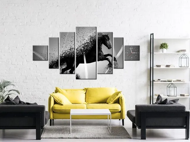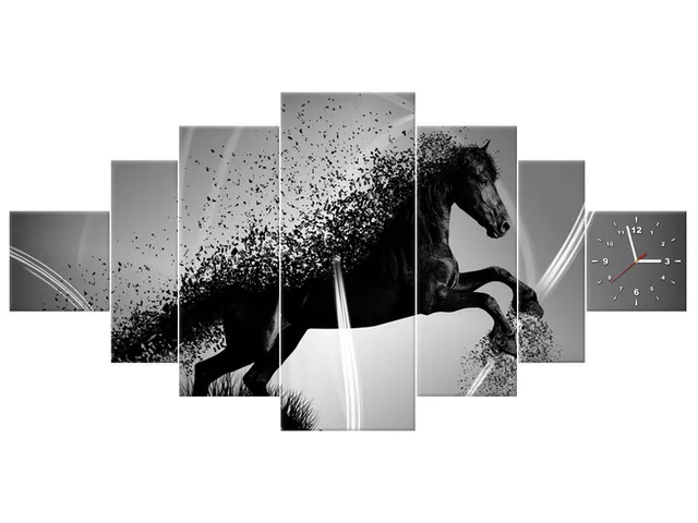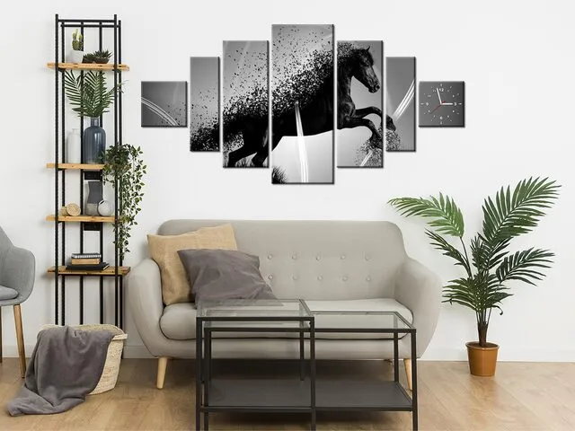 Úvod » Obrazy » Obrazy s hodinami » Obraz s hodinami Čierno biely kôň fragmentácia - Jakub Banas