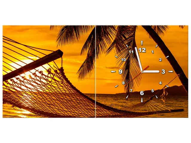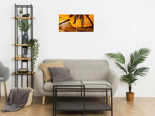 Úvod » Obrazy » Obrazy s hodinami » Obraz s hodinami Hojdacia sieť na pláži pri západe slnka