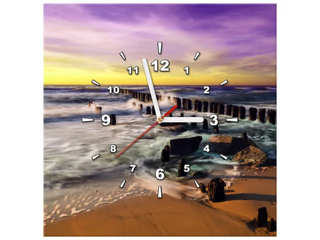 Barion Pixel Obraz s hodinami Západ slnka nad morskou plážou s fialovou oblohou