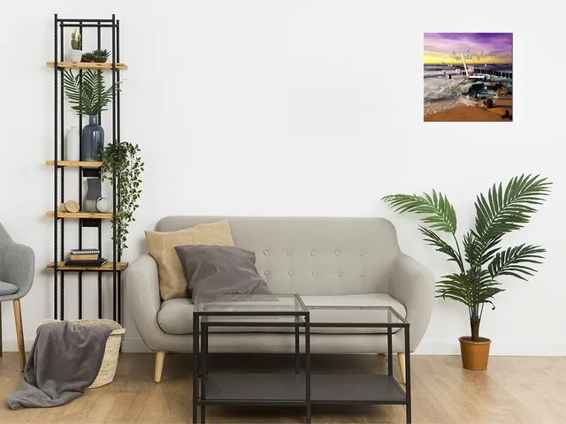 Úvod » Obrazy » Obrazy s hodinami » Obraz s hodinami Západ slnka nad morskou plážou s fialovou oblohou