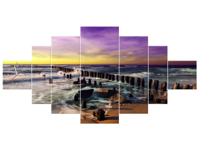 ZP3126A_2J Obraz s hodinami Západ slnka nad morskou plážou s fialovou oblohou |
