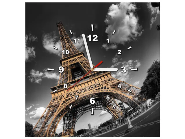 Úvod » Obrazy » Obrazy s hodinami » Obraz s hodinami na plátne Pohľad z dola na Eiffelovku