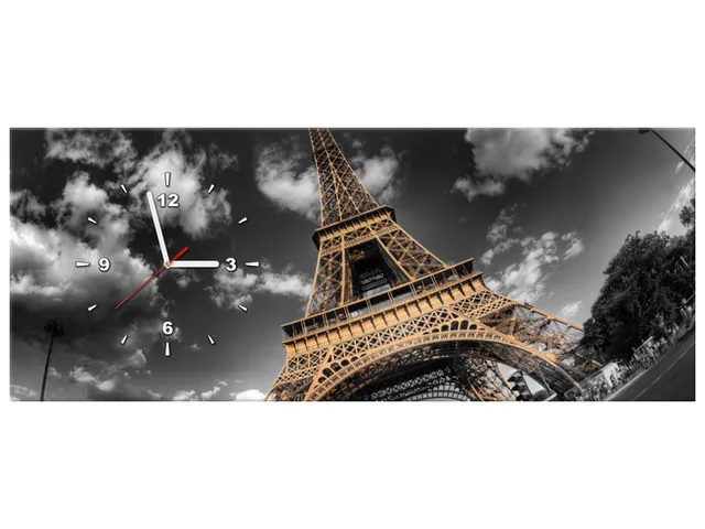 Úvod » Obrazy » Obrazy s hodinami » Obraz s hodinami na plátne Pohľad z dola na Eiffelovku