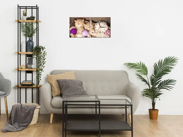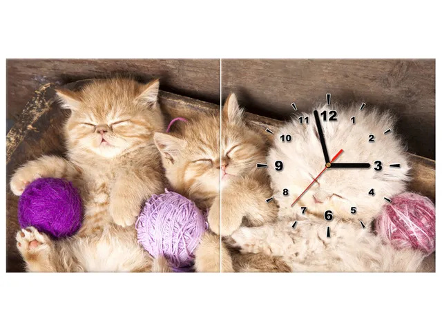 Úvod » Obrazy » Obrazy s hodinami » Obraz s hodinami na plátne Spiace mačiatka v miske
