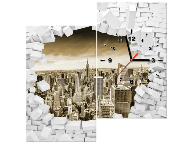 Stena s výhľadom na mesto v sépii Obraz s hodinami