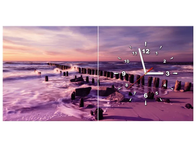 Západ slnka nad morskou plážou vo fialovej Obraz s hodinami